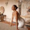 Le bustier entièrement en dentelle, finement travaillé, se prolonge en douceur sur le bas de la jupe en crêpe ,créant une harmonie parfaite entre matière et silhouette.