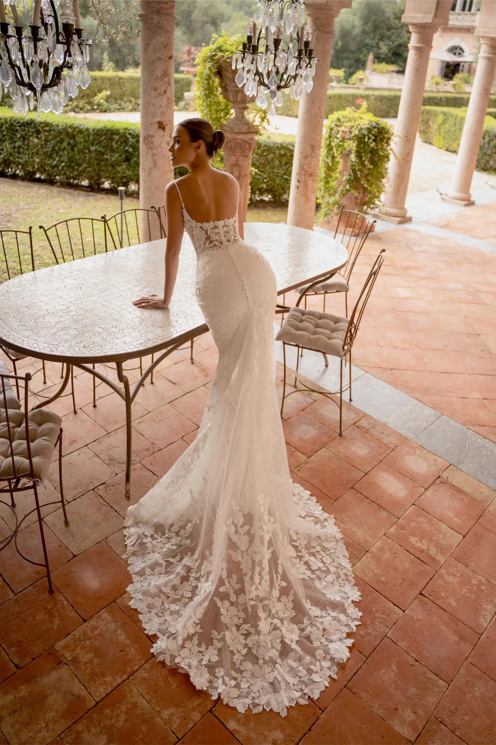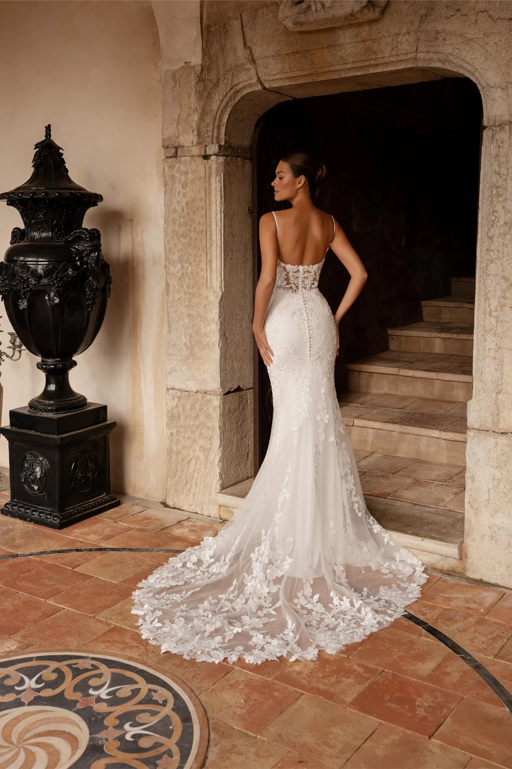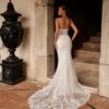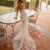 La traine en dentelle raffinée ajoute une touche de romantisme, tandis que le dos soigneusement travaillé révèle une allure captivante sous tous les angles.