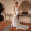 Elégance et sensualité se rencontre avec cette robe de mariée sirène à fine bretelles, sublimée par un décolleté plongeant qui met en valeur la féminité avec délicatesse.