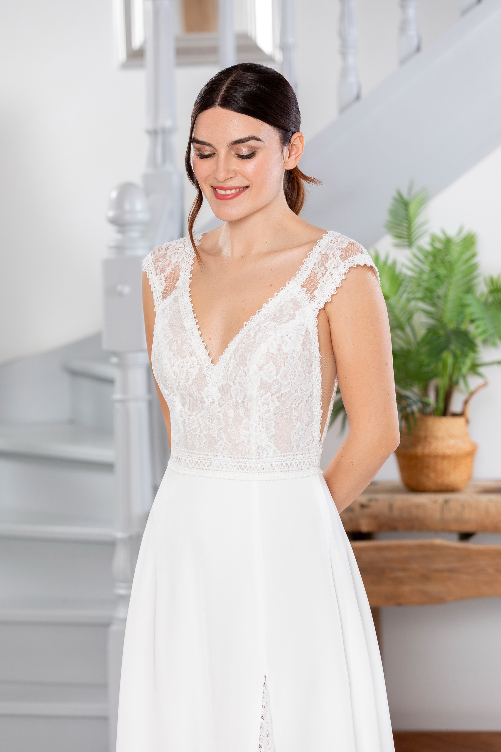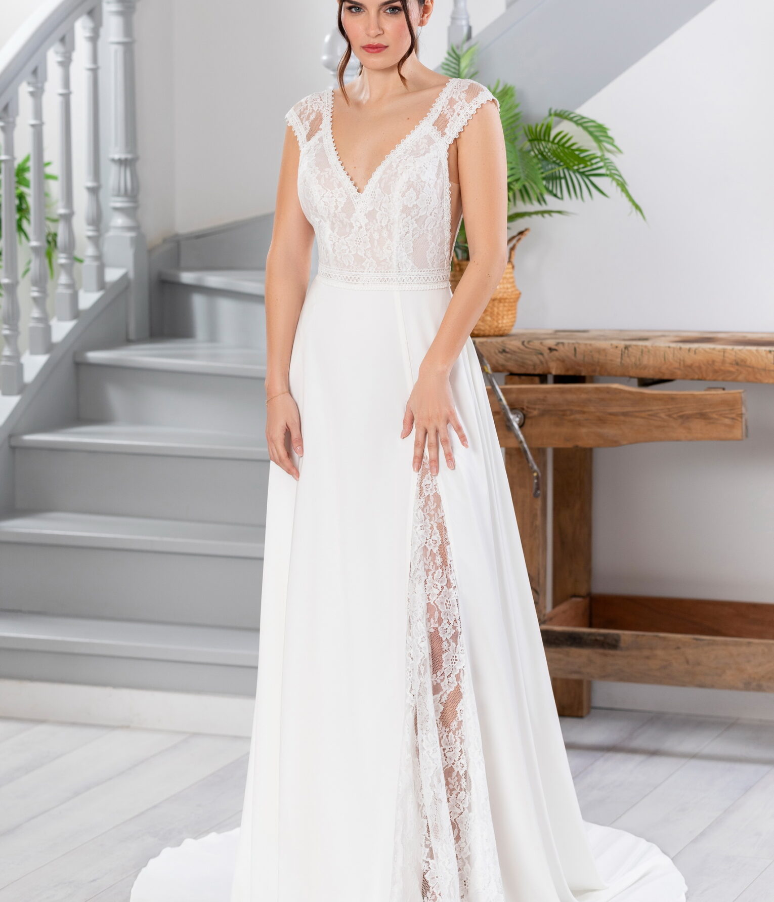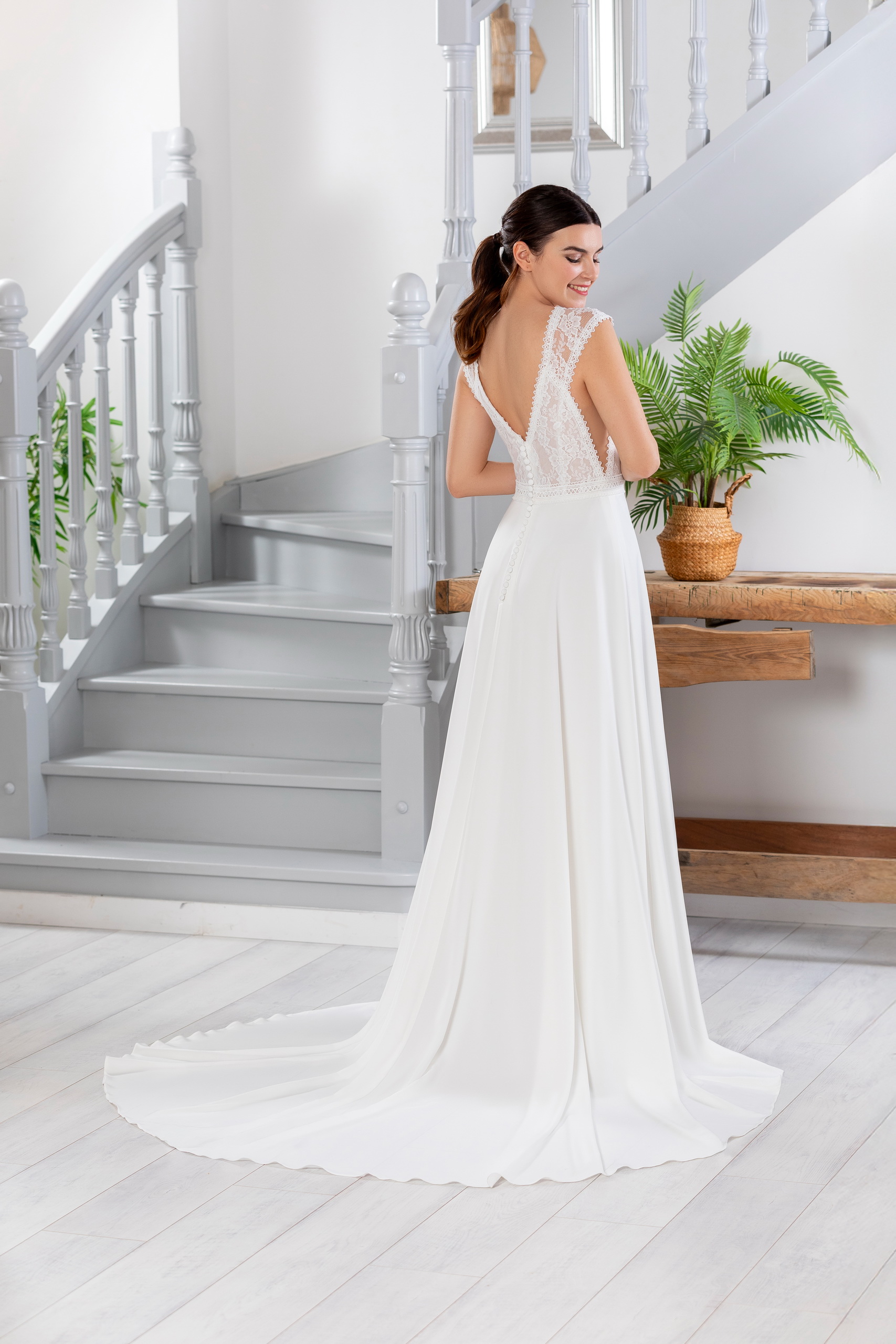 Découvrez la robe de mariée idéale Amour pour une allure à la fois bohème et sensuelle. Ce modèle unique est confectionné en crêpe fluide, avec un bustier en dentelle délicate et un décolleté plongeant à l’avant comme à l’arrière. La jupe, légère et fluide, est sublimée par une fente discrète qui laisse entrevoir la jambe, et une découpe sur le côté apporte une touche de raffinement supplémentaire. Ce modèle met en valeur la silhouette tout en légèreté et élégance. Venez l’essayer chez Marilyn Création, votre boutique de robes de mariée à Marignane, au cœur des Bouches-du-Rhône.