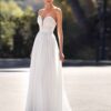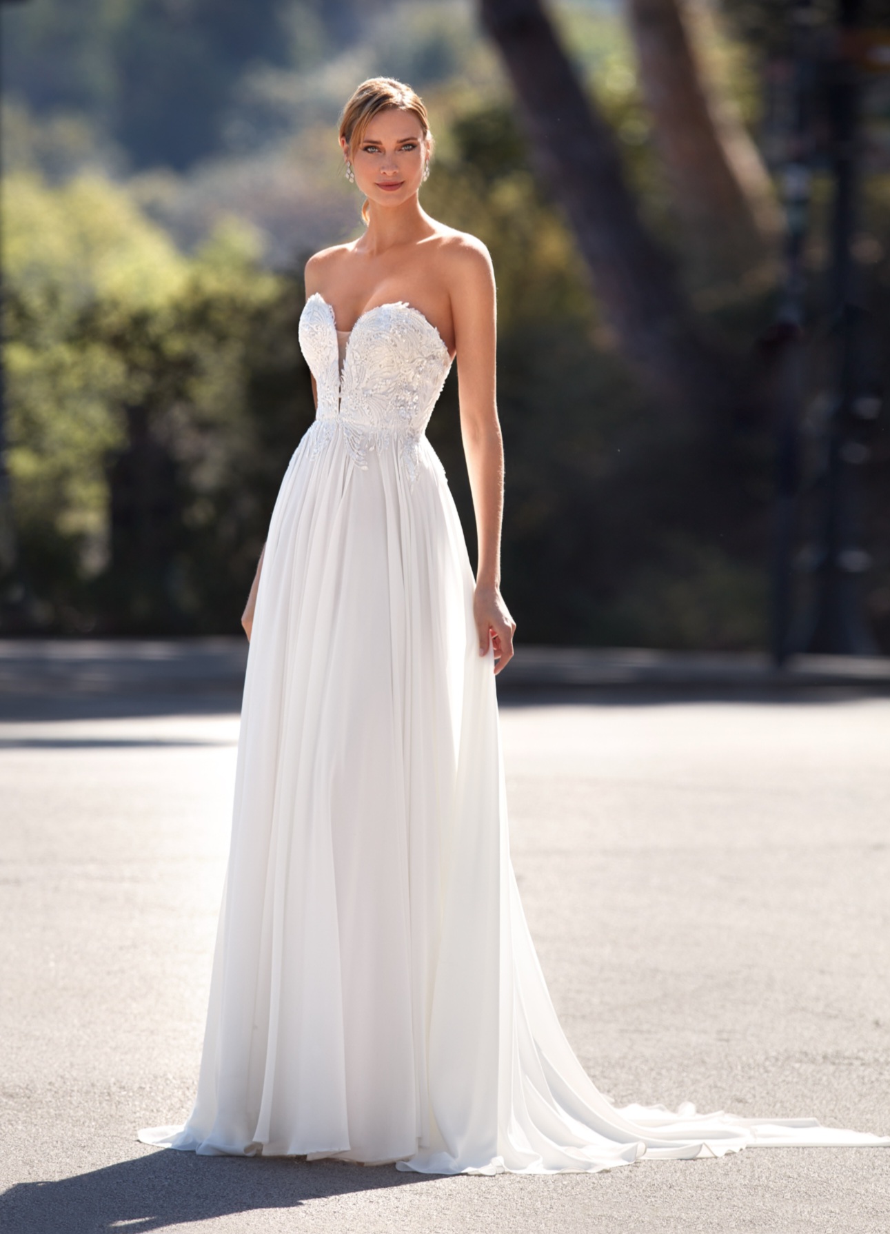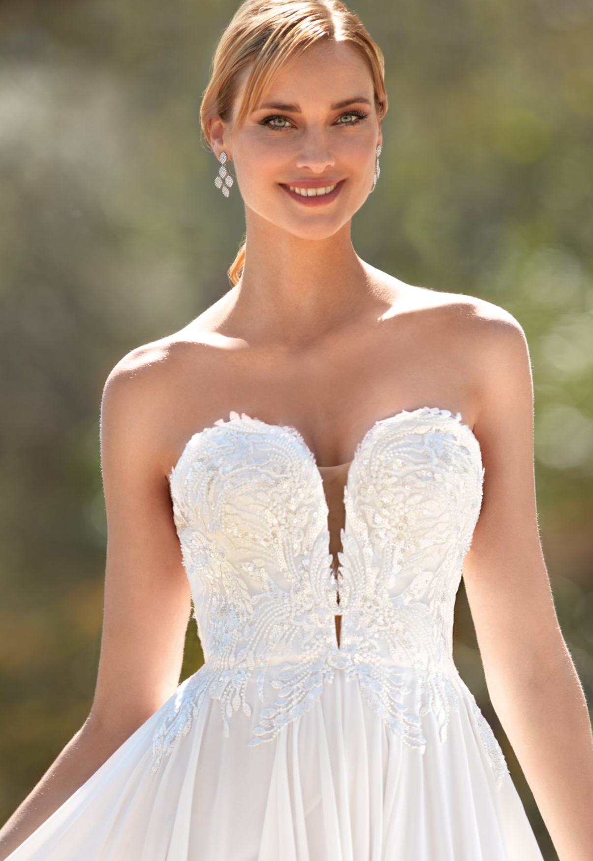 Étiquettes : bustier en dentelle, décolleté plongeants devant, petite traine, robe de mariée bustier, robe en mousseline fluide