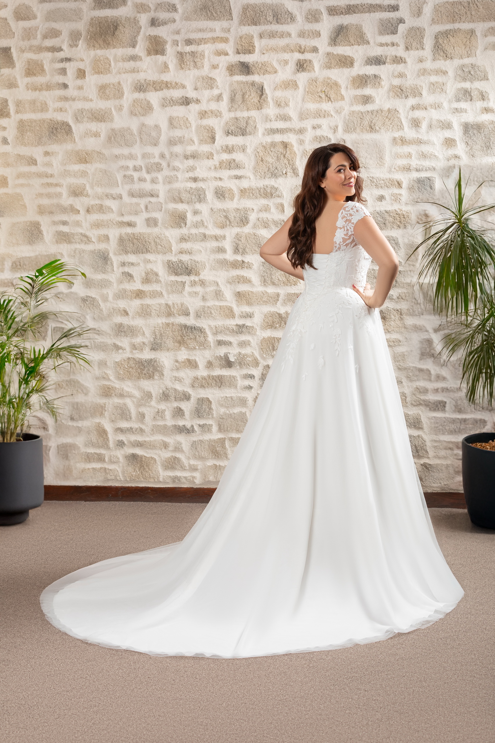 Son décolleté plongeant avec bretelles montantes en dentelle et ses manchettes tombantes offre allure sensuelle, tandis que le dos plongeant et son laçage qui ajoute une touche de modernité et de glamour.