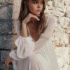 Robe fluide en tulle de style bohème. Son bustier en dentelle au décolleté profond avec ses élégantes manches longues.