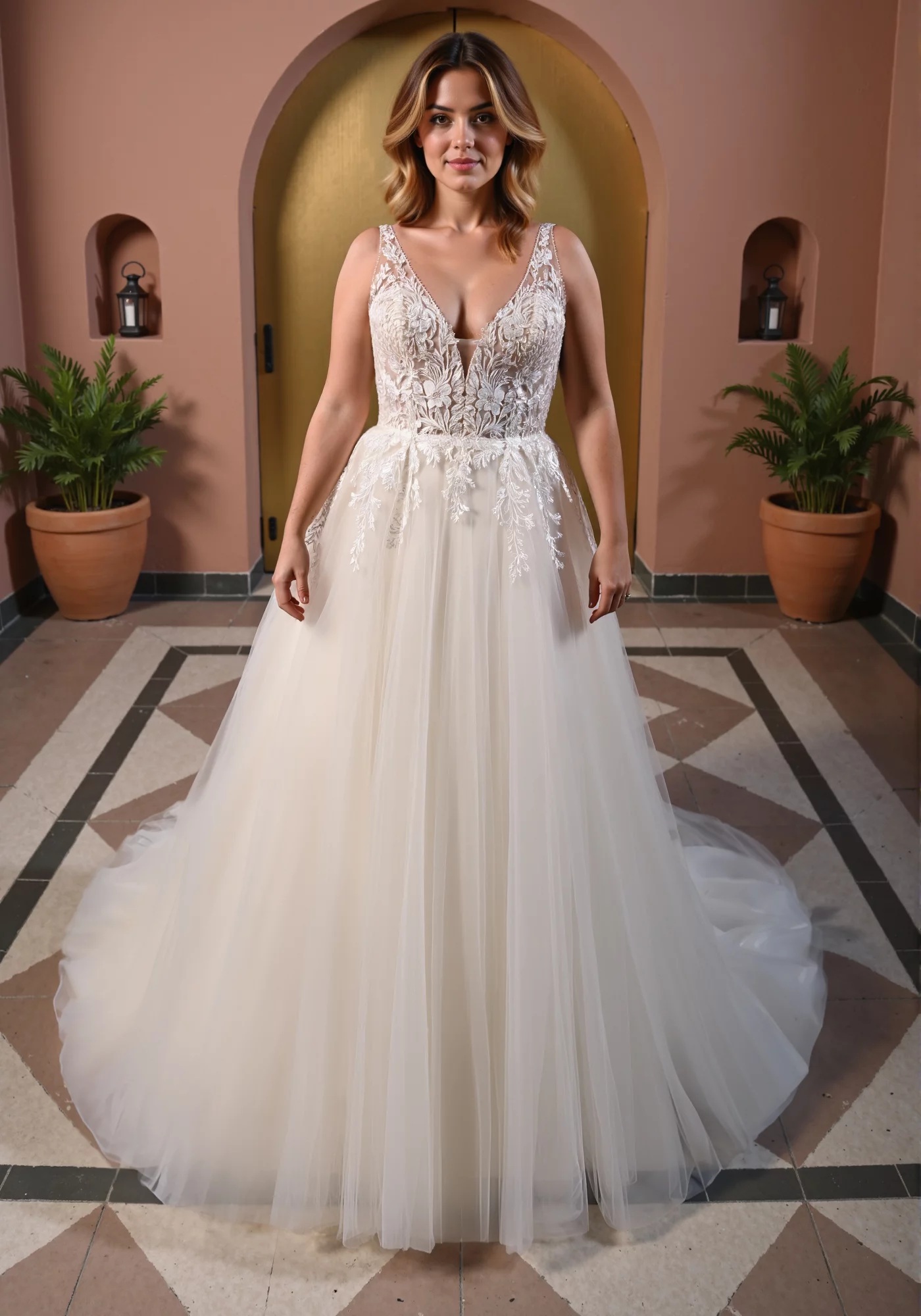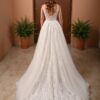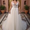La dentelle raffinée du bustier se prolonge délicatement sur la jupe en tulle et la traine bordée de dentelle apporte une finition majestueuse sans excès de volume.