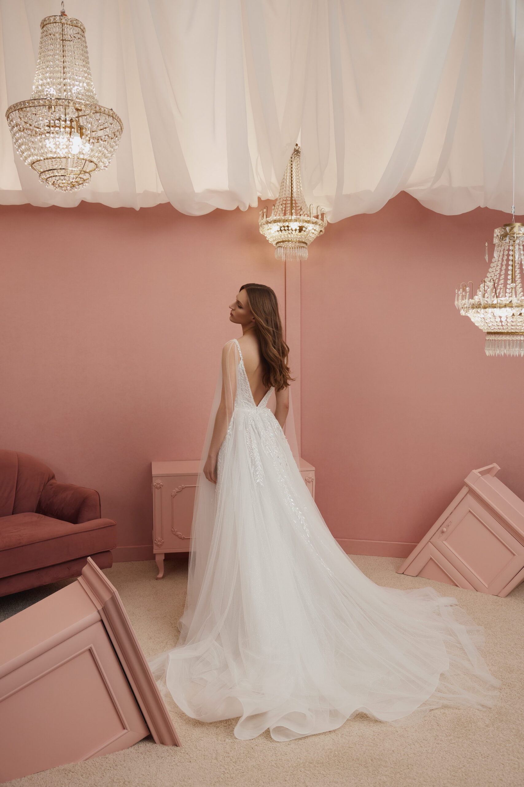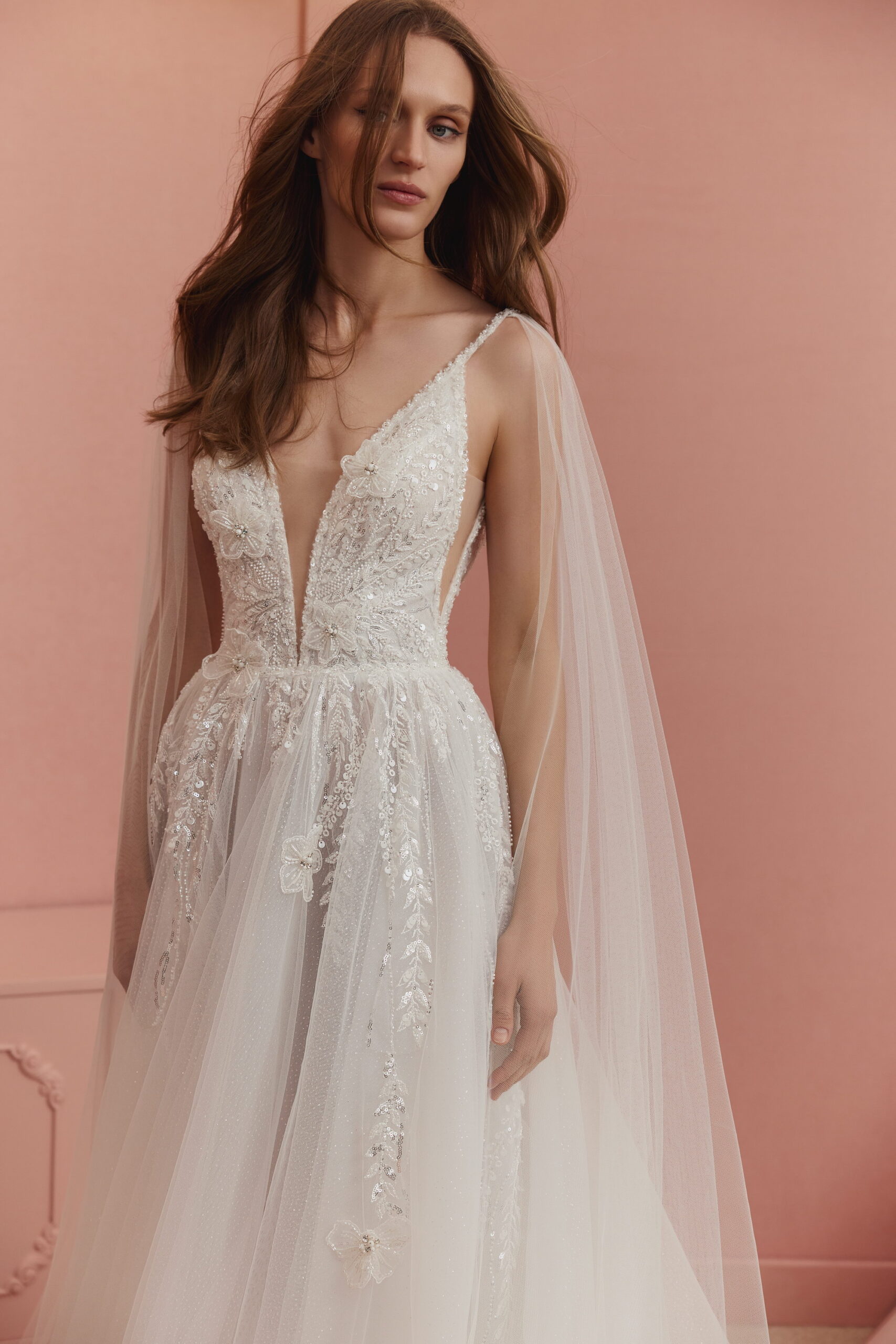 Des pans de tulle amovibles, attachés aux bretelles, viennent délicatement encadrer les épaules et peuvent être retirés selon le choix de la mariée, pour un style modulable et unique.