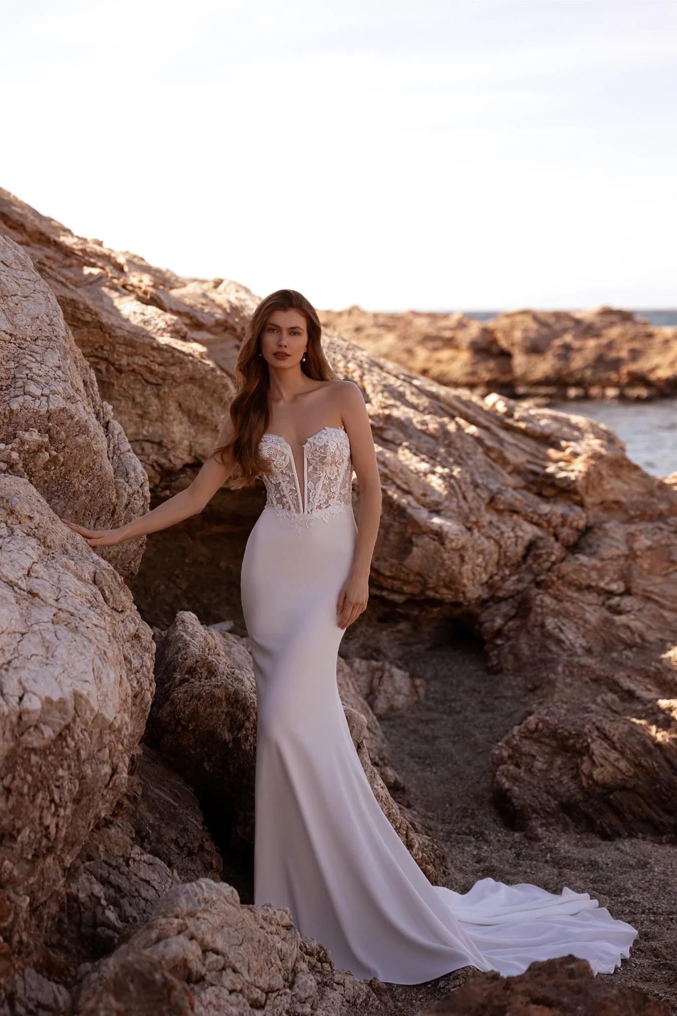Plongez dans l élégance avec cette sublime robe, un modèle raffiné en crêpe fluide qui épouse parfaitement la silhouette. Son bustier effet guêpière en dentelle délicate, ornée de baleines apparentes et d un décolleté plongeant, apporte sensualité et modernité à la mariée. Idéale pour un mariage chic et intemporel , cette robe séduit par sa légèreté et sa coupe parfaitement ajustée.