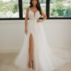 Découvrez l élégance intemporelle avec cette somptueuse robe de mariée Cassandra de la collection Eveline, un modèle pensé pour sublimer chaque silhouette. Son corsage en dentelle délicate au décolleté plongeant et aux fines bretelles apporte une touche de sensualité raffinée, tandis que sa jupe fluide se pare de dentelle en décoration, subtilement disposées sur le bas et en cascade le long de la robe, laissant voir par la fente la jambe.