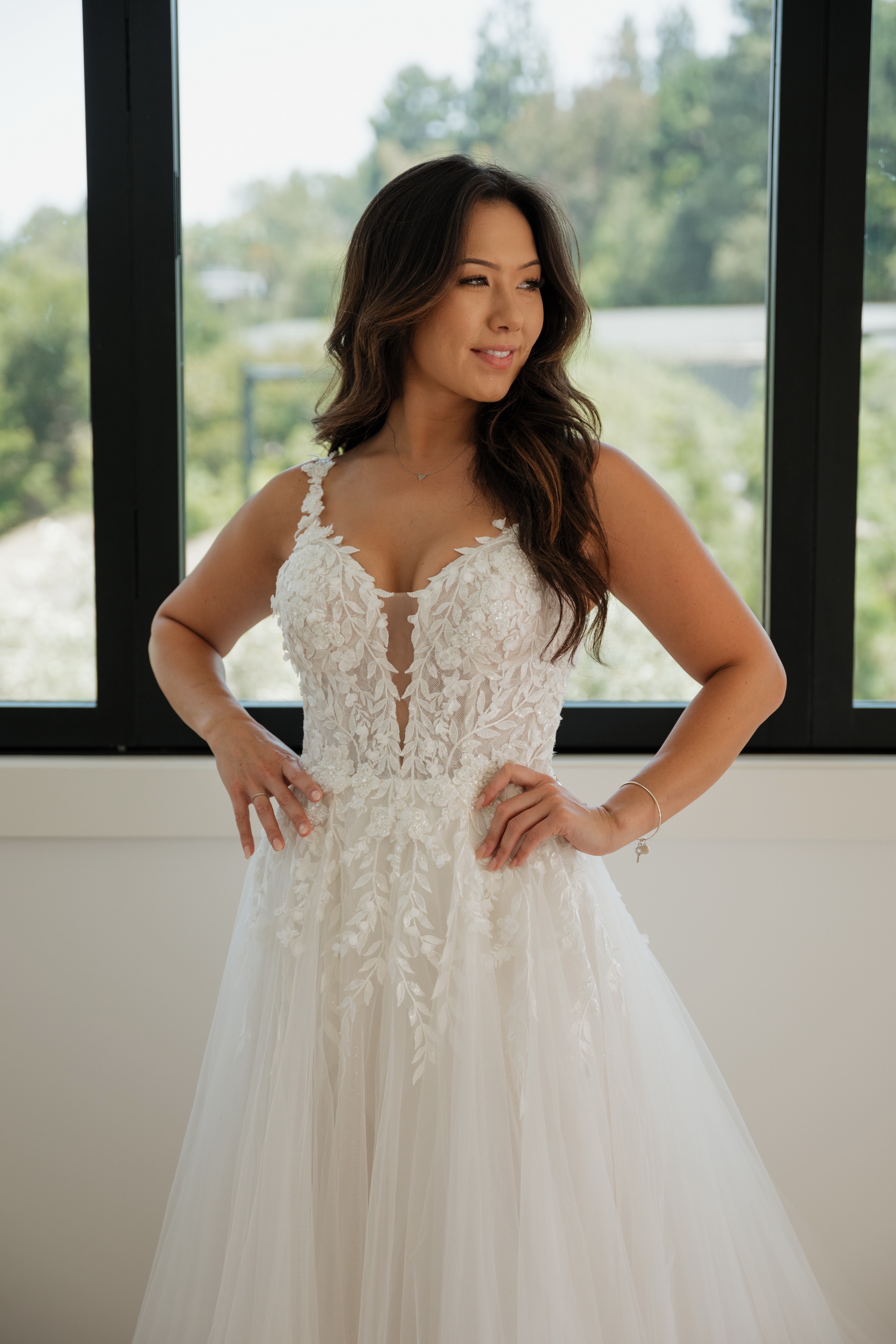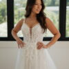 Découvrez l élégance intemporelle avec cette somptueuse robe de mariée de la collection Miss Kelly, un modèle pensé pour sublimer chaque silhouette. Son corsage en dentelle délicate au décolleté plongeant et aux fines bretelles apporte une touche de sensualité raffinée, tandis que sa jupe fluide se pare de dentelle en décoration, subtilement disposées sur le bas et en cascade le long de la robe .