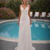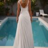 Un jeu de plis raffinés part des hanches et descend harmonieusement jusqu’ a la traine, apportant un mouvement fluide et sophistiqué.
