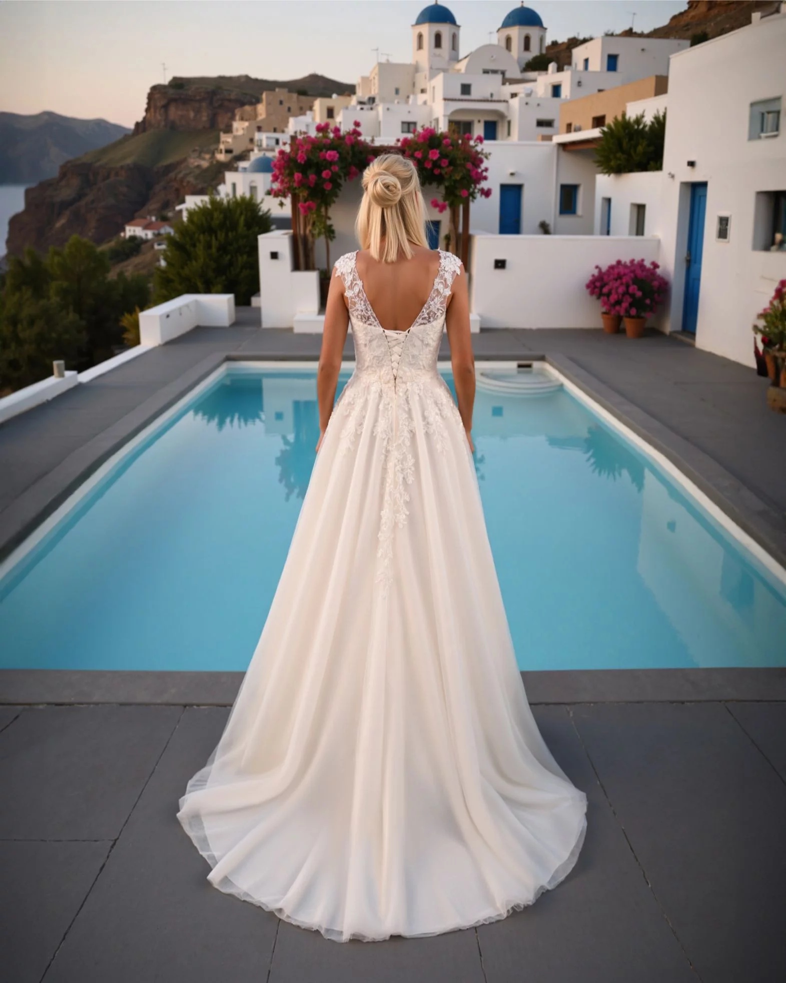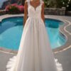 Découvrez l élégance intemporelle avec cette somptueuse robe de mariée de la collection lovely, un modèle pensé pour sublimer chaque silhouette. Son corsage en dentelle délicate au décolleté plongeant et aux bretelles qui apporte une touche de sensualité raffinée, tandis que sa jupe fluide en tulle subtilement disposées sur le bas et en cascade le long de la robe .