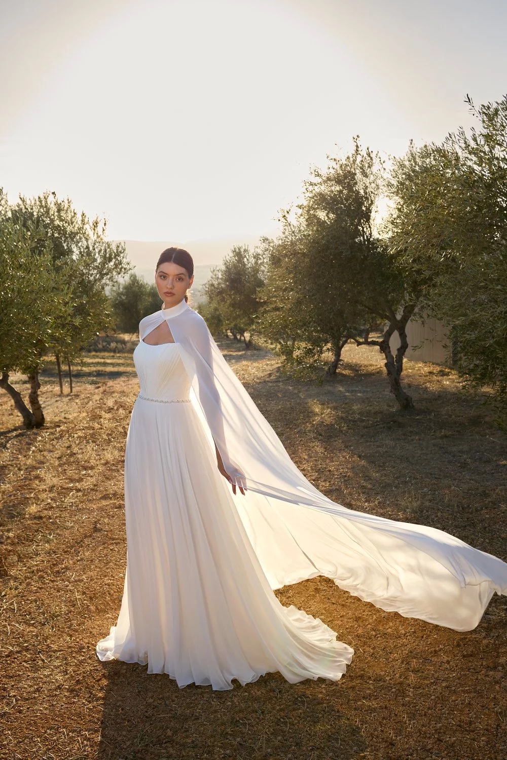 L atout séduction de se modèle :une cape en mousseline ,qui encadre le buste et sublime la silhouette avec élégance.