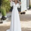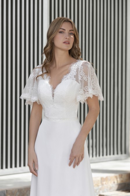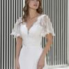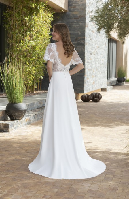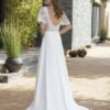 Sa jupe en mousseline fluide vient souligner les détails raffinés du buste et se terminant par une courte traîne