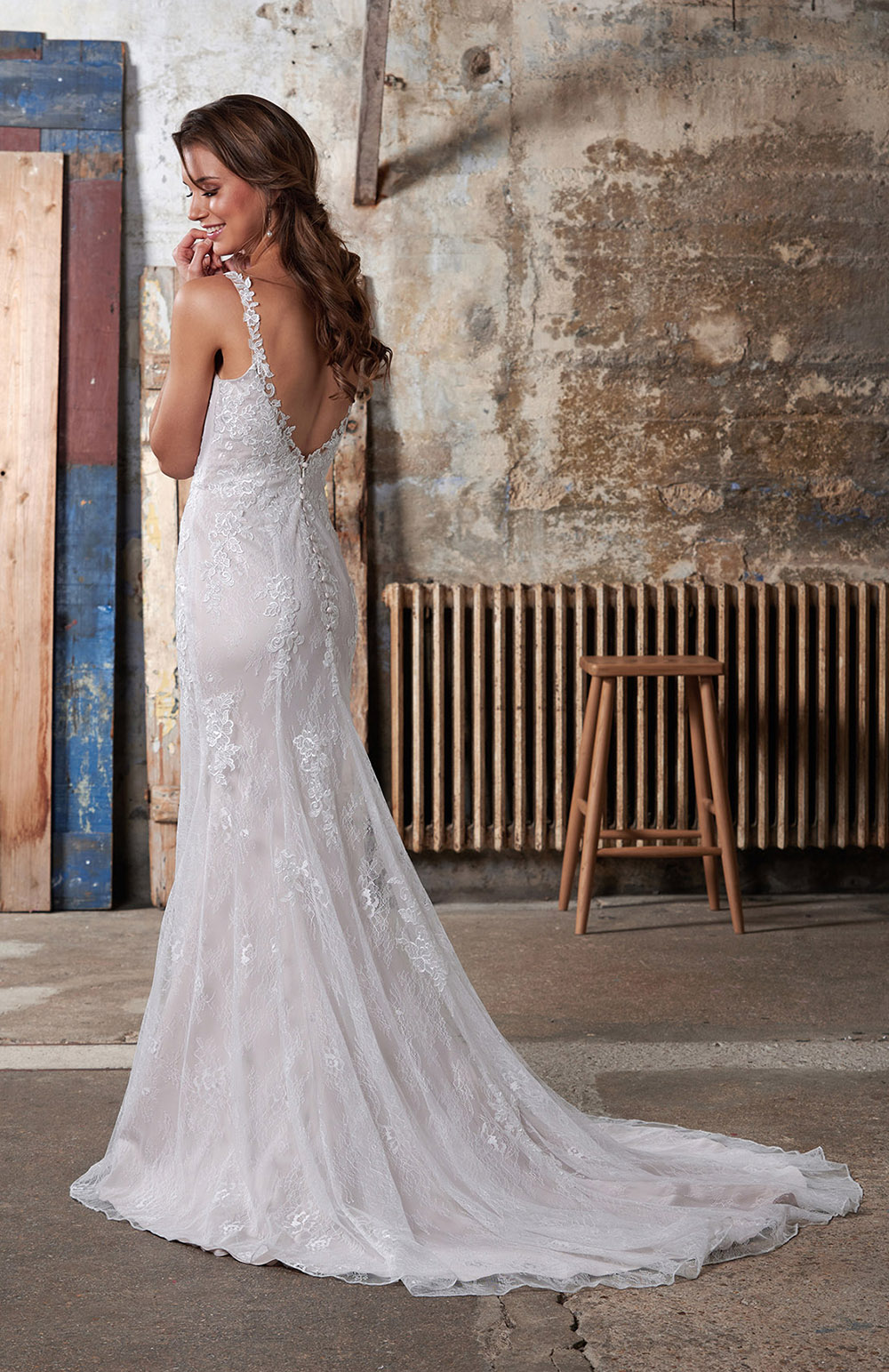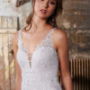 Une robe de mariée forme sirène tout en dentelle, un décolleté plongeant avec de très jolies bretelles dentelées et un dos en V