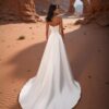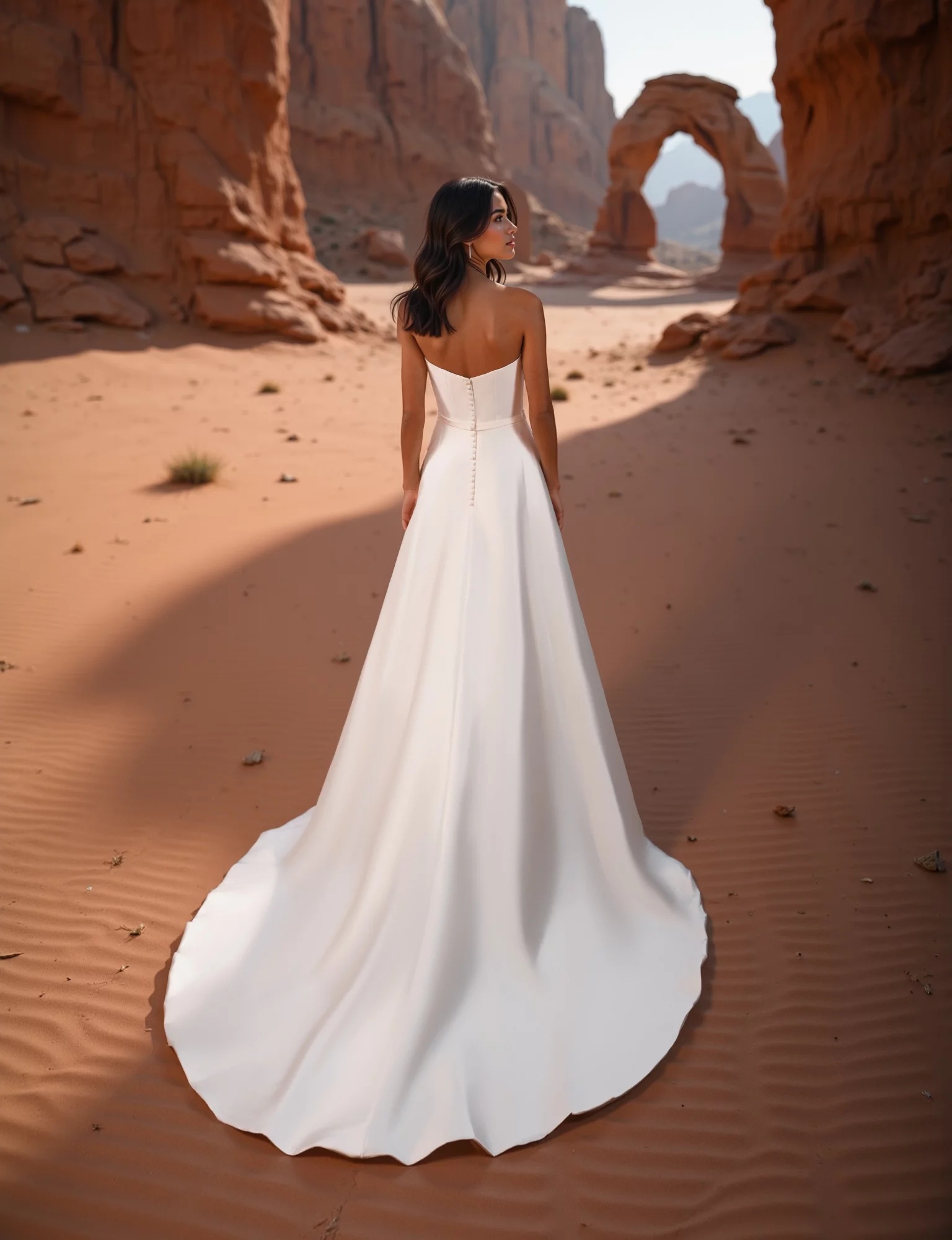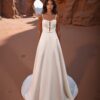 Une robe de mariée en satin d une élégance rare. Avec sa coupe simple et raffinée, ses fines bretelles délicates et son décolleté sublimé par une fente élégante sur le devant du corsage .Elle incarne la féminité moderne