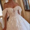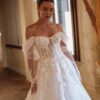 Le modèle Kyllie – Dominiss est une robe de mariée princesse féérique avec un corsage guêpière à laçage, des manchettes tombant sur les épaules, une jupe en tulle vaporeux et une dentelle 3D raffinée en bordure. Une robe magique, digne des plus beaux contes de fées.