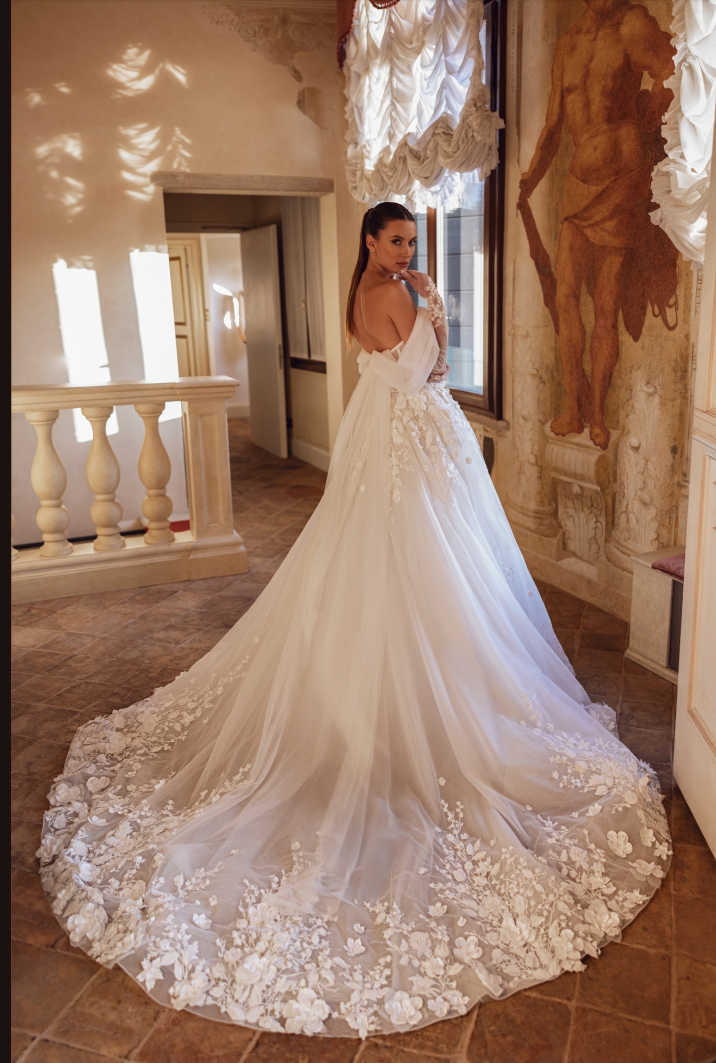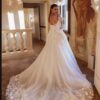 Sa jupe vaporeuse en tulle, aérienne et majestueuse, crée un effet spectaculaire tout en légèreté. Le bas de la robe est sublimé par une dentelle en 3D d’une finesse remarquable, qui se fond avec élégance sur la jupe et rappelle la magie des robes de princesses. Chaque détail, de la dentelle en relief aux finitions soignées, transforme cette création en une pièce extraordinaire, idéale pour toutes celles qui rêvent d’un mariage empreint de magie et d’élégance intemporelle.