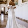 Le corsage en pointe, à l’avant comme à l’arrière, souligne la féminité et l’élégance naturelle de la mariée.