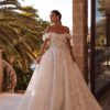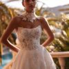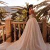 La jupe ample en organza, légère et élégante , dévoile de subtils motifs floraux en transparence, et s achève par une superbe traine affinée.