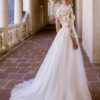 Cette création d’une rare élégance incarne parfaitement l’esprit d’une mariée bohème et princesse à la fois : une allure chic, douce et féminine, mise en valeur par un mouvement fluide et poétique.