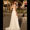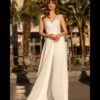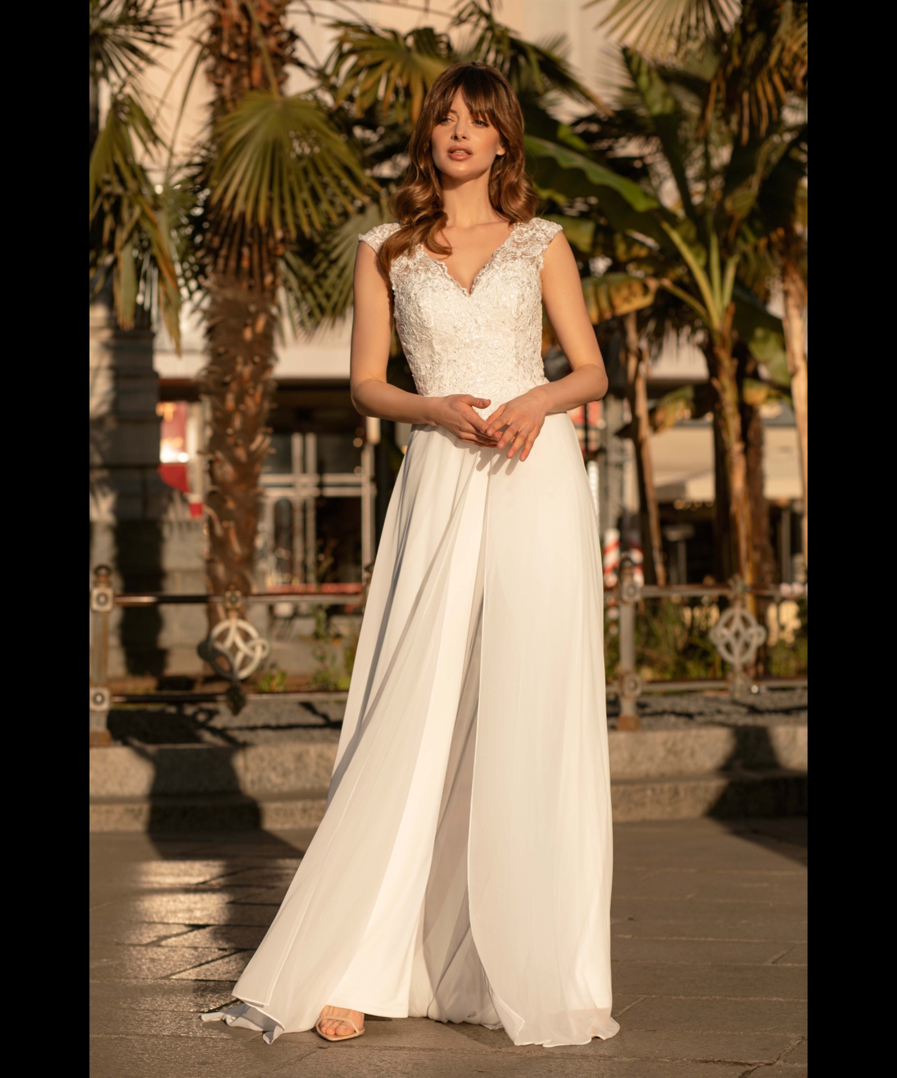 Étiquettes : Combinaison en mousseline fluide, Combinaison pantalon, corsage dentelle, décolleté en V devant et dos, Mariage civil, Moderne, Pantalon / Combinaison, petite traine