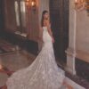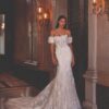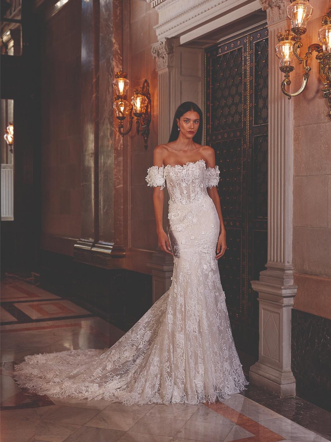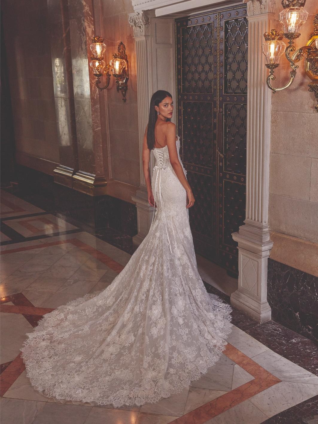 Sublime robe sirène bustier, entièrement en dentelle, dotée d un corsage baleiné qui sculpte la silhouette avec finesse. Les petits manchons amovibles ajoutent une touche délicate et romantique, tandis qu’ une traine majestueuse prolonge l allure. Le laçage raffiné du corsage apporte ce détail couture qui fait toute la différence.
