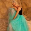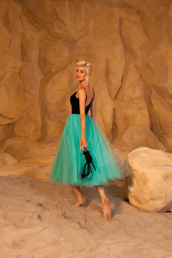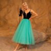 Étiquettes : bas de jupe en tulle, bustier en velours, bustier fines bretelles, décolleté en V, robe cocktail, robe en tulle, robe mi-longue