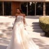 Somptueuse robe de mariée princesse avec légèreté signé Démétrios, avec un bustier tout en dentelle et un bas vaporeux en tulle orné de dentelle délicate. Ses manches bouillonnées en tulle, resserrées par un poignet raffiné, apportent une touche romantique et royale.