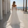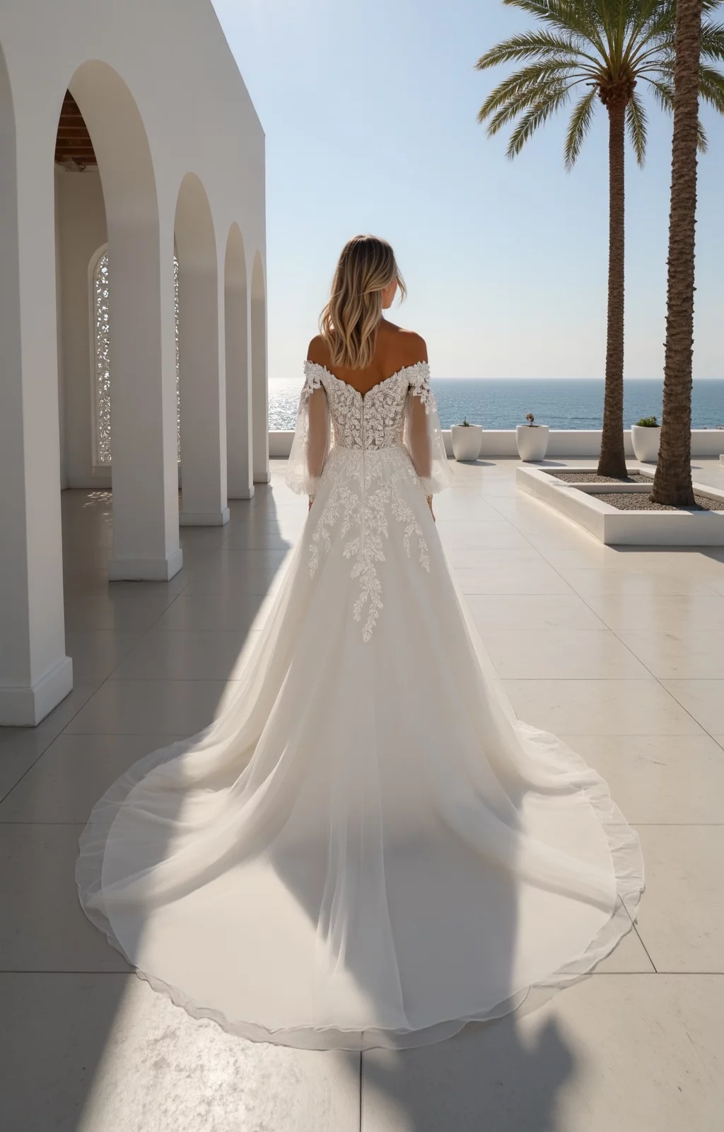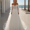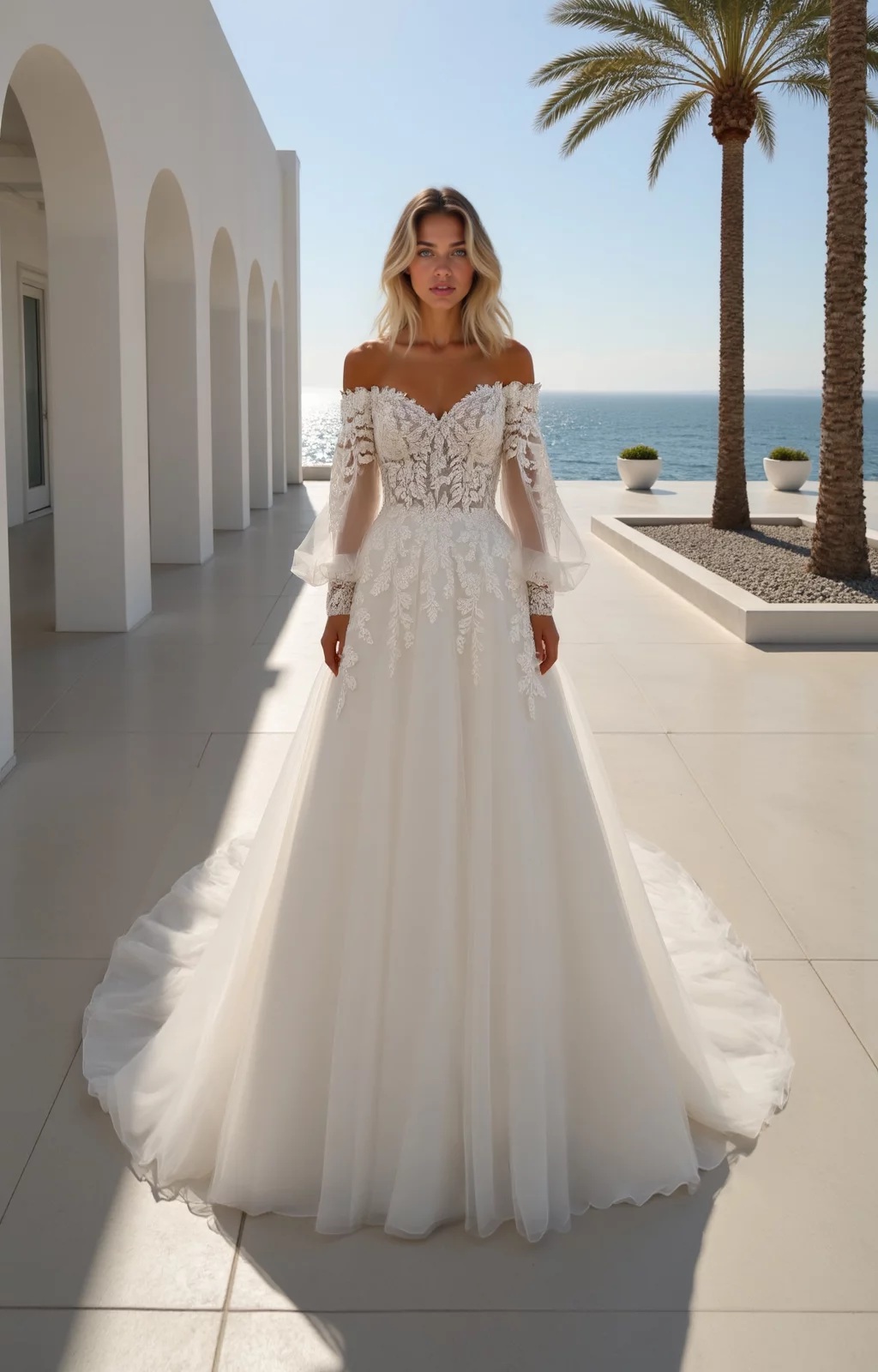Succombez au charme majestueux du modèle Sarah ,une robe de mariée princesse qui incarne élégance et romantisme .Son encolure bateau en dentelle , associé à de délicate manches longue bouillonnantes, met en valeur le port de la tête avec finesse . La jupe ample et fluide se pare d une somptueuse dentelle en cascade, descendant avec légèreté le long de la robe , pour se prolonger dans un train spectaculaire qui sublime chaque pas .