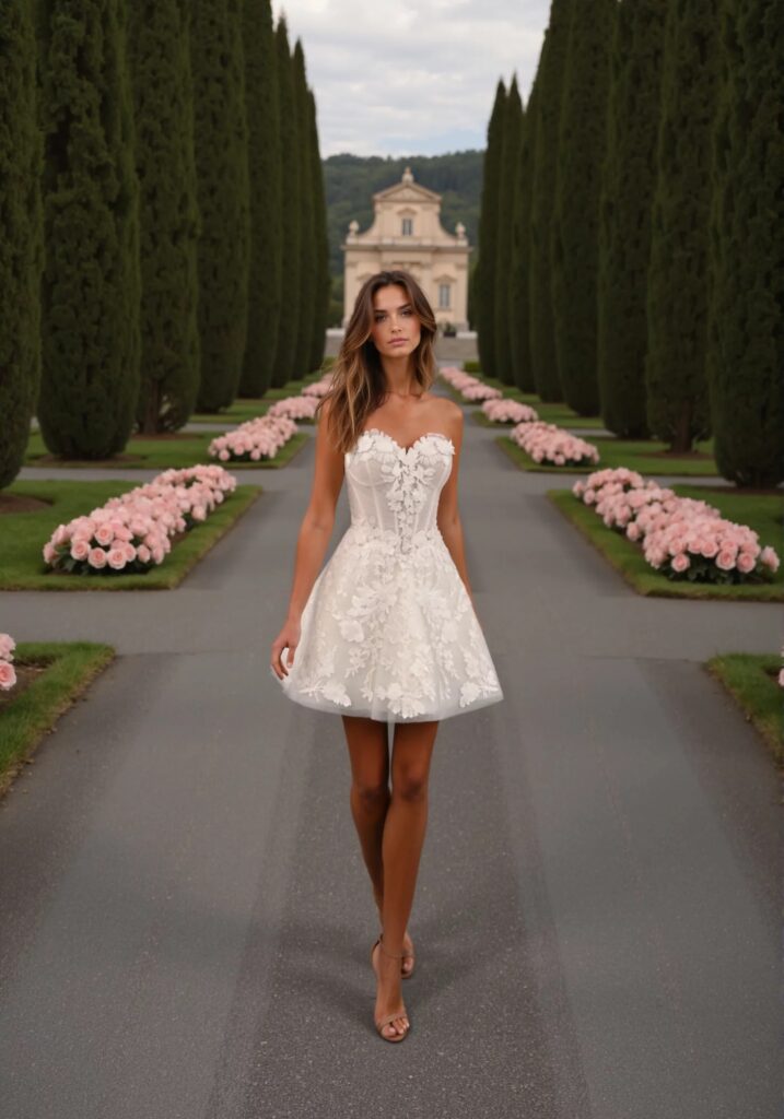 Cette robe courte bustier, avec son décolleté plongeant, incarne l’élégance et la sophistication. Parfaite pour un mariage civil ou une cérémonie intime.