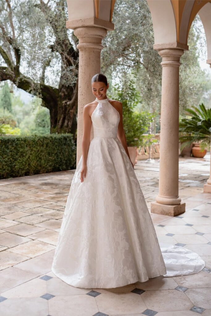 Succombez à l élégance unique de cette robe de mariée Mercedes Sposa issus de la nouvelle collection 2026 . Conçu dans une somptueuse matière avec des effets, ce tissus raffinée dévoile de délicat jeu de lumière et des motifs floraux subtils qui apporte éclat et modernité. de fleur.