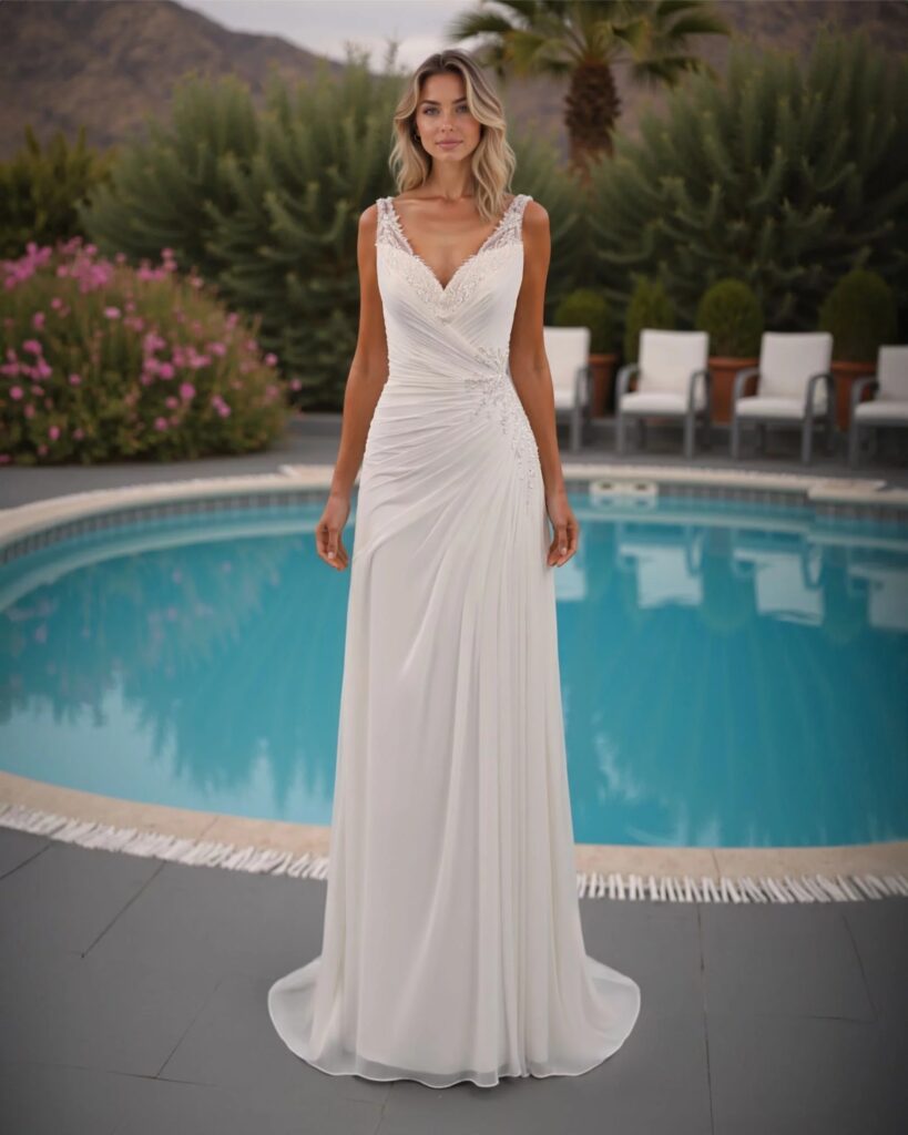 Plongez dans l élégance avec cette robe de mariée sensuelle aux fine bretelles en dentelle . Son corsage entièrement drapé jusqu’ aux hanches sublime la silhouette avec délicatesse.