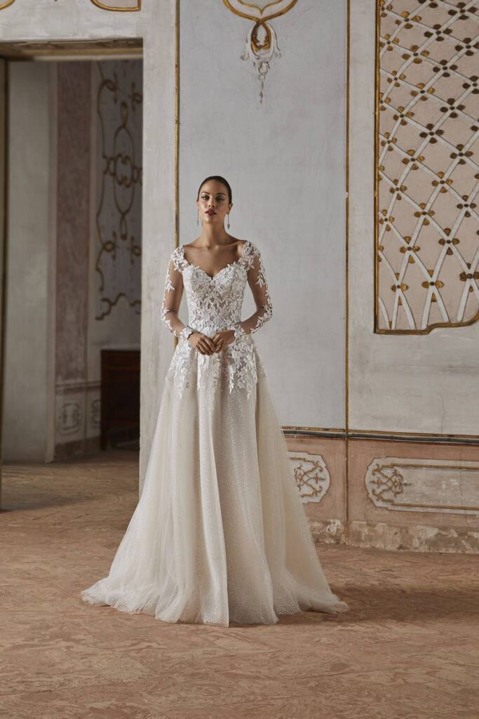 Découvrez l élégance intemporelle avec cette somptueuse robe de mariée de la collection Cosmobella, un modèle pensé pour sublimer chaque silhouette. Son corsage en dentelle délicate au décolleté plongeant et aux bretelles qui apporte une touche de sensualité raffinée, tandis que sa jupe fluide se pare de dentelle en décoration, subtilement disposées sur le bas et en cascade le long de la robe .