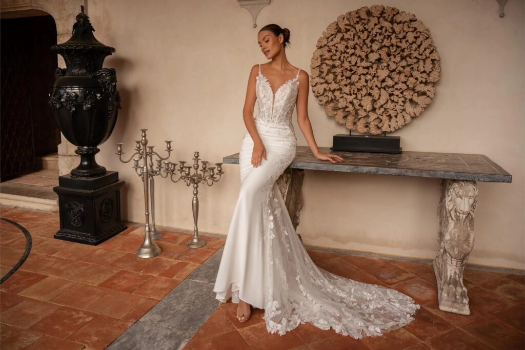 Elégance et sensualité se rencontre avec cette robe de mariée sirène à fine bretelles, sublimée par un décolleté plongeant qui met en valeur la féminité avec délicatesse.