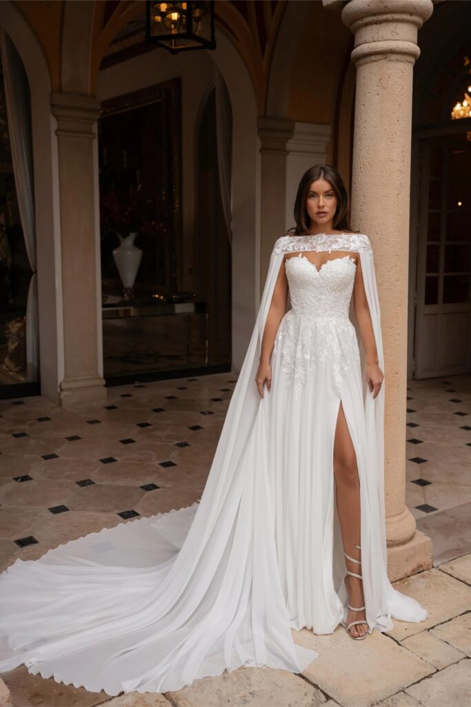 L atout séduction de se modèle :une cape en mousseline ornée d bande en dentelle sur le haut, qui encadre le buste et sublime la silhouette avec élégance.