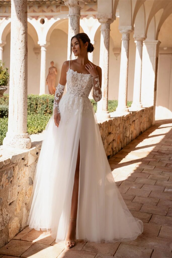Osez la sensualité et l élégance avec cette somptueuse robe de mariée à l encolure carrée, délicatement soutenue par de fine bretelles.